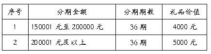 活动内容:活动期间,客户持状态正常的龙卡信用卡在下述指定的活动经销商,刷建行信用卡成功办理36期汽车分期付款业务且分期金额达到相应标准,即有机会获得相应档次的礼品,礼品数量有限,先到先得,具体标准如下: