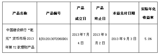 根据与投资者的约定,中国建设银行北京分行发行的下列理财产品已经到期并完成资金兑付,现将理财产品兑付及清算情况进行信息披露: