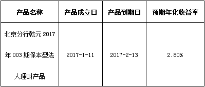 关于北京分行乾元2017年003期保本型法人理财产品成立的公告