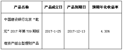 关于中国建设银行北京“乾元”2017年第709期标准资产组合型理财产品成立的公告