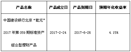 关于中国建设银行北京“乾元”2017年第059期标准资产组合型理财产品成立的公告