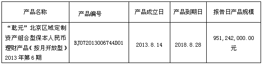 我行依照《中国银监会关于规范商业银行理财业务投资运作有关问题的通知》(银监发【2013】8号)要求,现对“乾元”北京区域定制资产组合型保本人民币理财产品(按月开放型)2013年第6期投资非标准化债权资产清单披露如下: