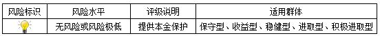 本期产品为保本浮动收益型理财产品,本理财产品有投资风险,只保障理财资金本金,不保证理财收益,您应当充分认识投资风险,谨慎投资。本期产品期限为34天(中国建设银行有权对产品进行展期或提前终止)。本期产品内部风险评级级别为一盏警示灯,风险程度属于无风险或风险极低,适用于保守型、收益型、稳健型、进取型及积极进取型投资者。最不利情况下,客户只能收回投资本金,不能获得任何投资收益。