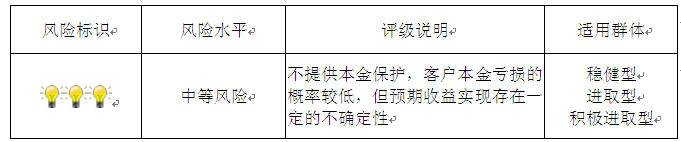 本产品为非保本浮动收益型理财产品,不保证本金和收益,预期收益、预计收益、测算收益、预期年化收益率等表述均不等同于实际收益。请您充分认识投资风险,谨慎投资。产品期限为8(中国建设银行有权提前终止或展期产品),产品存续期内任一产品工作日接受申购/追加投资申请,客户的持有份额在封闭120后,可于任意开放日申请赎回(超过单个客户累计赎回限额的赎回申请除外,巨额赎回时请以公告为准)。本期产品内部风险评级级别为3盏警示灯,风险程度属于中等风险。最不利情况下,资产组合无法回收任何本金和净收益,客户将损失全部本金。产品适合于稳健型、进取型及积极进取型客户。