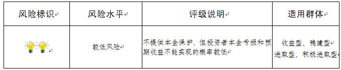 本期产品为非保本浮动收益型理财产品,不保证本金和收益,请您充分认识投资风险,谨慎投资。本期产品期限116天(中国建设银行有权对本期产品进行展期和提前终止),存续期内产品不接受申购或赎回申请。本期产品内部风险评级级别为2盏警示灯 ,风险程度属于较低风险。最不利情况下,资产组合无法回收任何本金和净收益,客户将损失全部本金。产品适合于收益型、稳健型、进取型、积极进取型客户。
